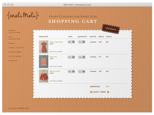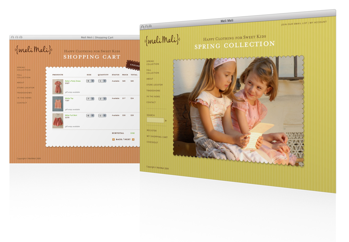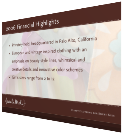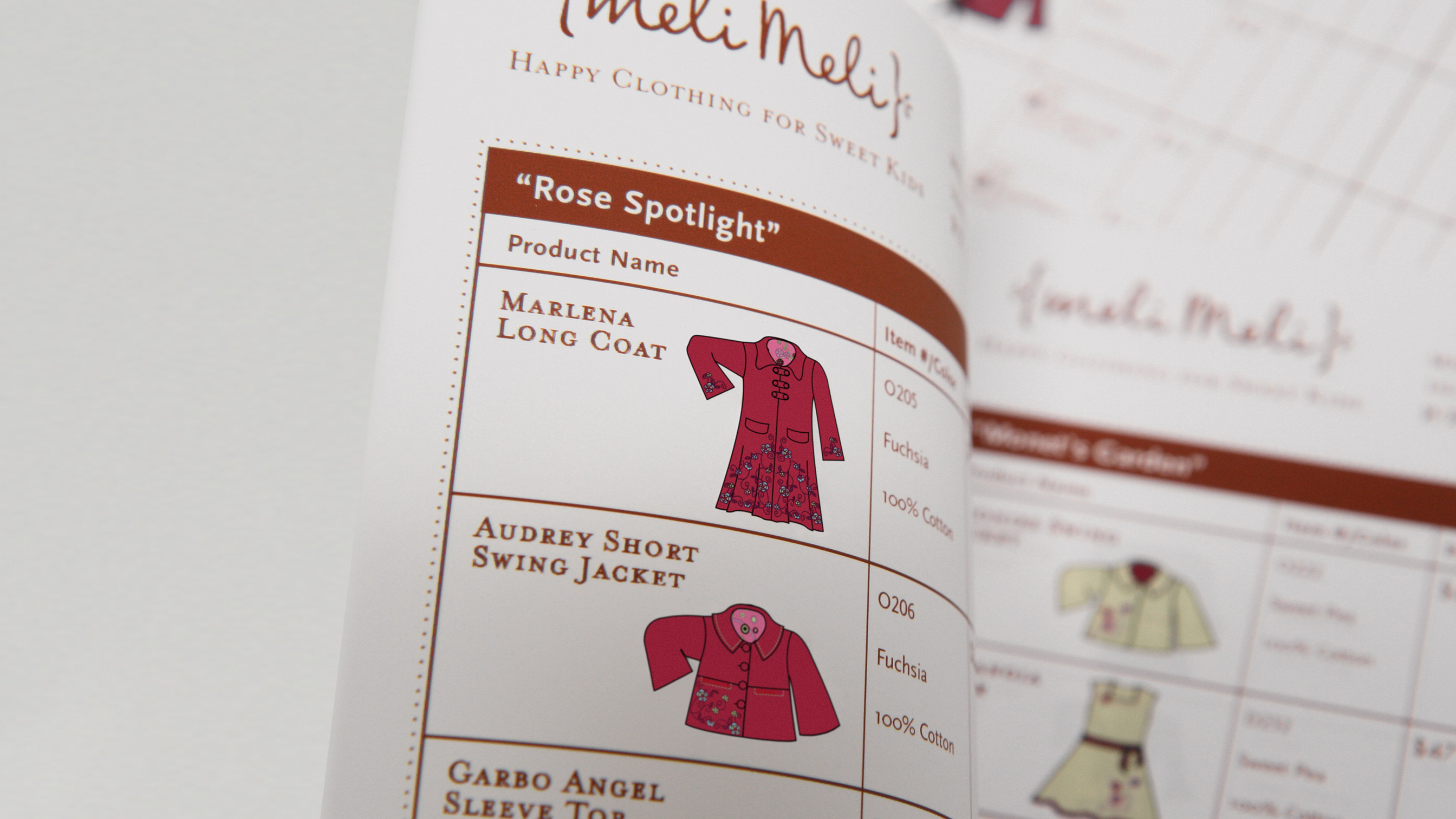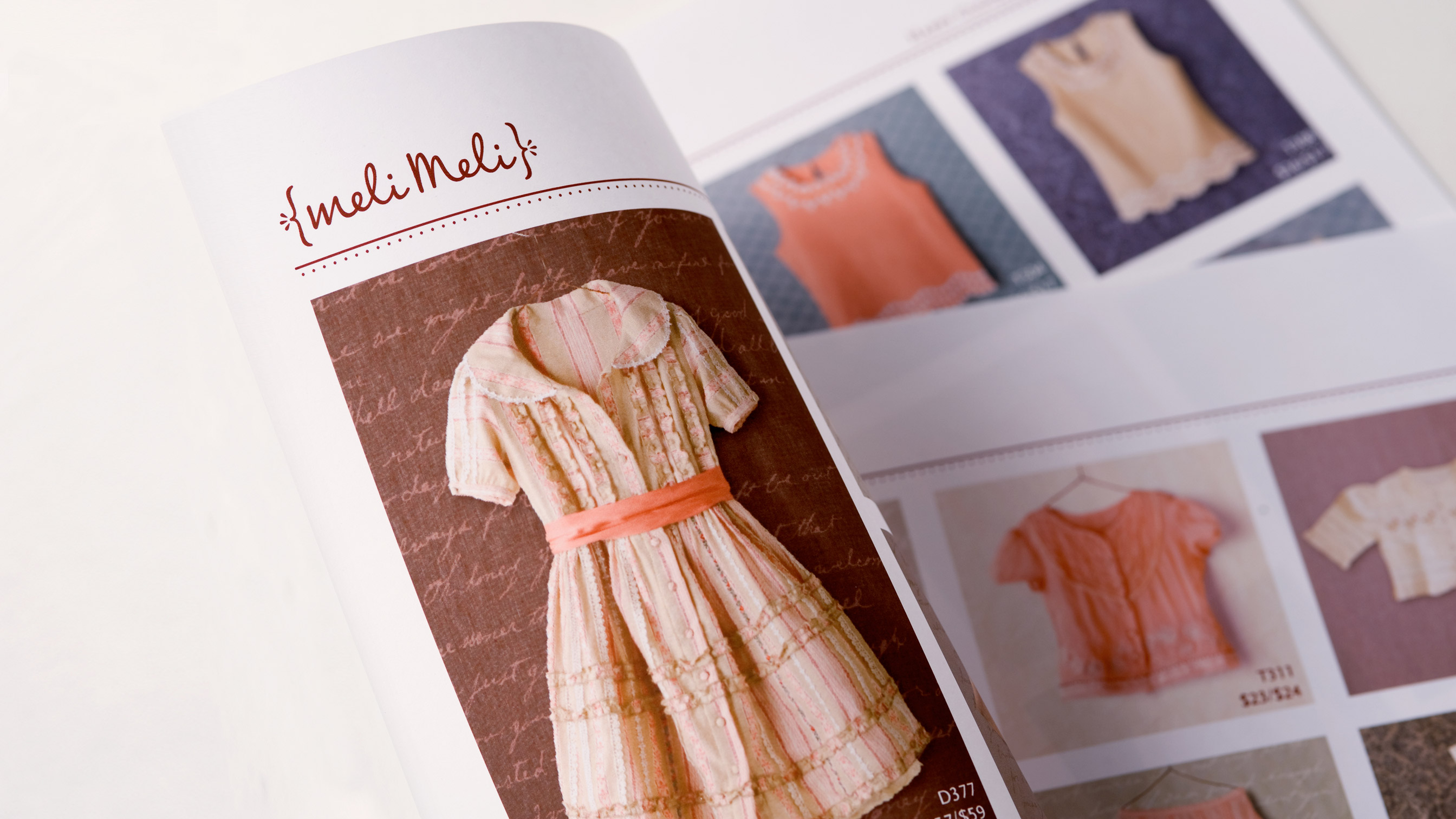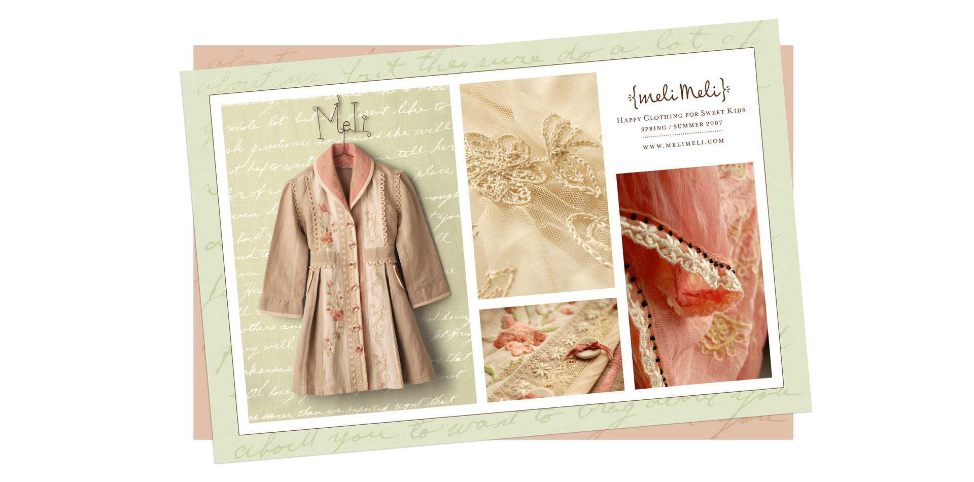 When Meli Meli’s business began to garner attention, it was time to create a brand that matched their unique clothing. We designed a whimsical logo to complement the essence of the clothing, and extended the vintage playfulness across the entire identity, including a small but impactful promo that became key to gaining rapid exposure. After that, business boomed from one rep in California to five reps nationwide, and from five boutiques to over 100 within just one season.