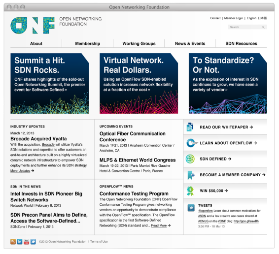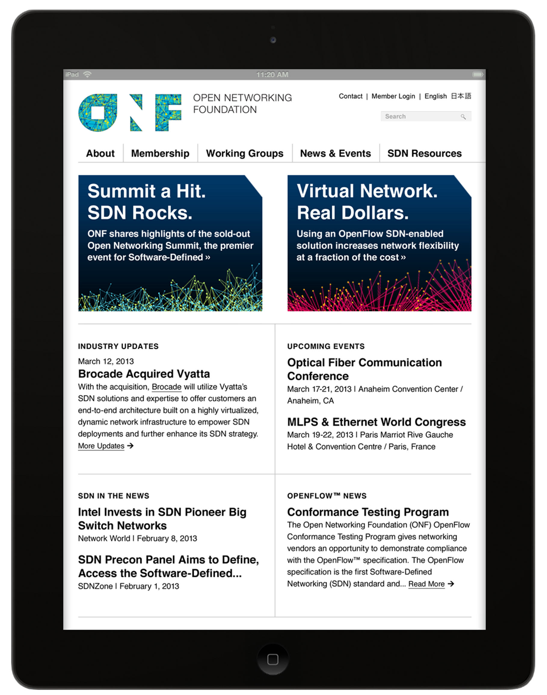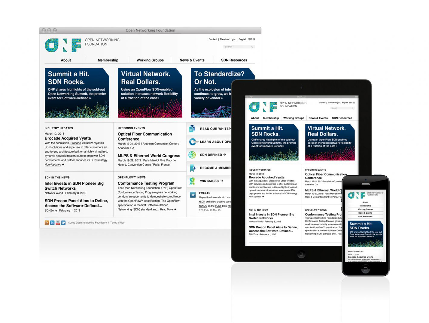 ONF is a user-driven organization dedicated to promoting Software-Defined Networking (SDN), an architecture that makes the Internet more manageable, dynamic and adaptable. Developing SDN protocol and standards make it possible to add features and reduce costs. Our experience with technology companies made us the ideal company to create ONF’s complete identity and help them solidify their position as leaders in their field.