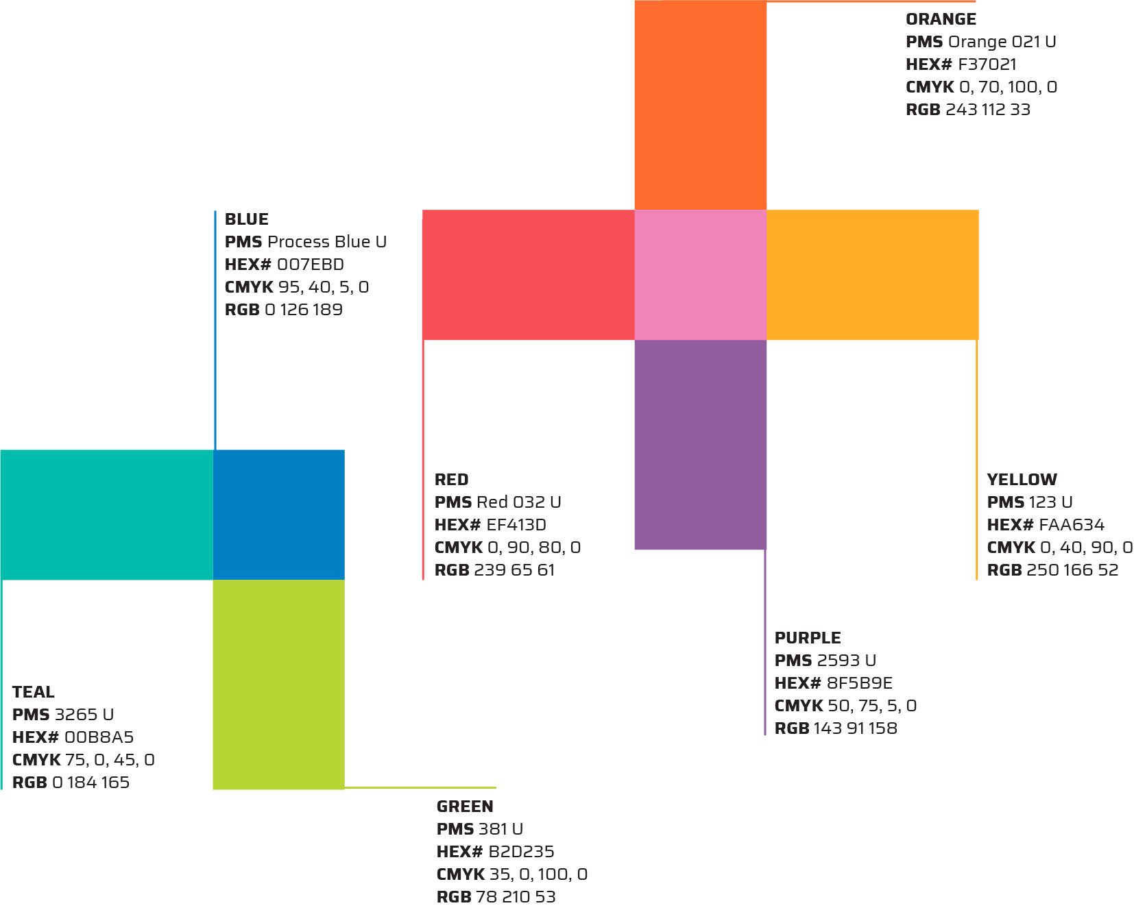 The colorful and modular main brand identity allowed us to create individual identities for each WFC sub-brand out of the main logo. Each sub-brand got it’s own section of the WFC color wheel, and then we built it out from there staying true to their hue. So they work both on their own and together as a family.