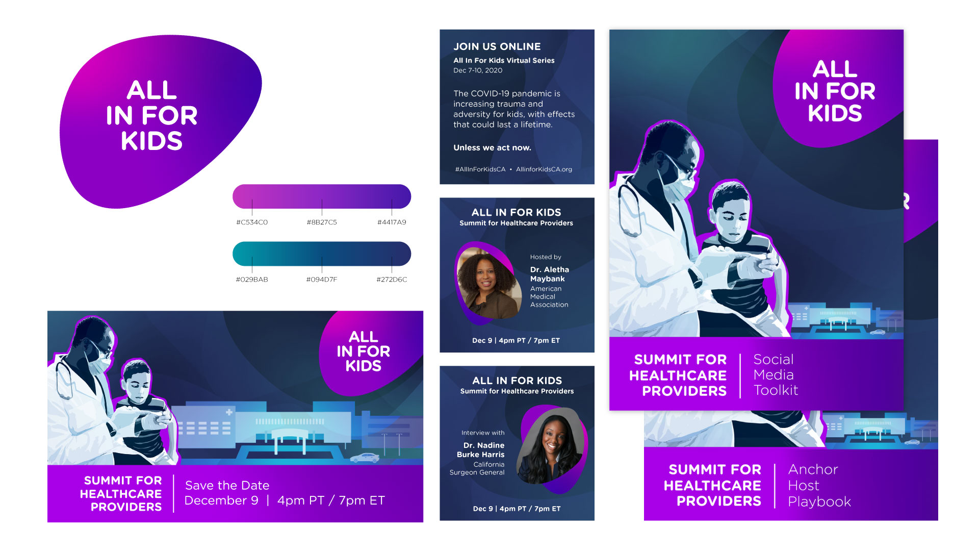 Research shows that traumatic stress during childhood can harm child development, resulting in higher rates of life-threatening diseases over time. Futures Without Violence (FWV) has always supported Bay Area communities in preventing adverse childhood experiences. Sadly, COVID-19 has exacerbated these challenges with a disproportionate impact on communities of color. To help families cope, FWV secured seed funding from Genentech and created All In For Kids, a series of virtual summits raising awareness and urgency for this public health crisis. With design inspired by community murals, the event featured a star-studded lineup of healthcare professionals, journalists, and artists giving advice, solutions, and wellness tips to help everyone address this global experience.