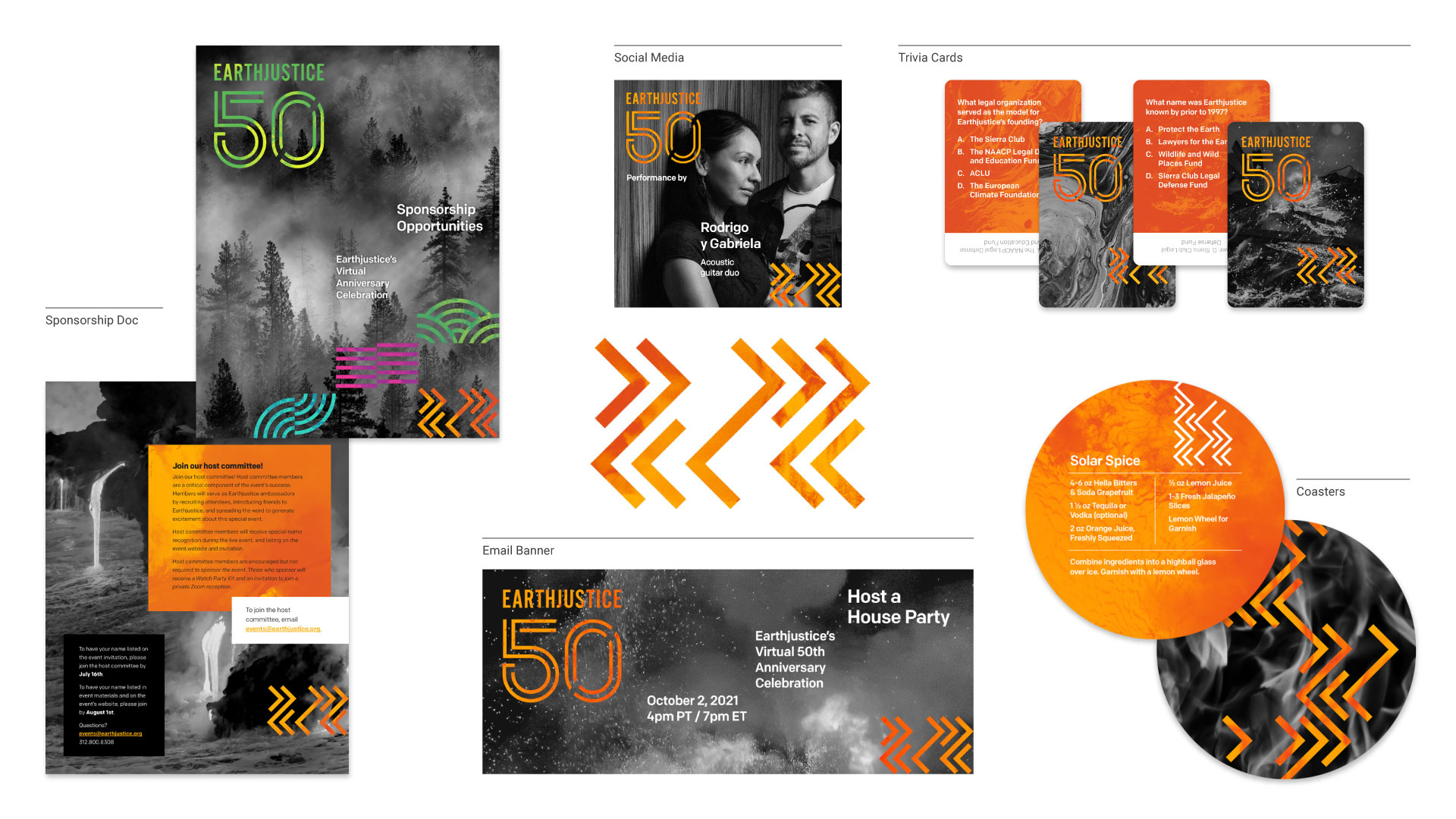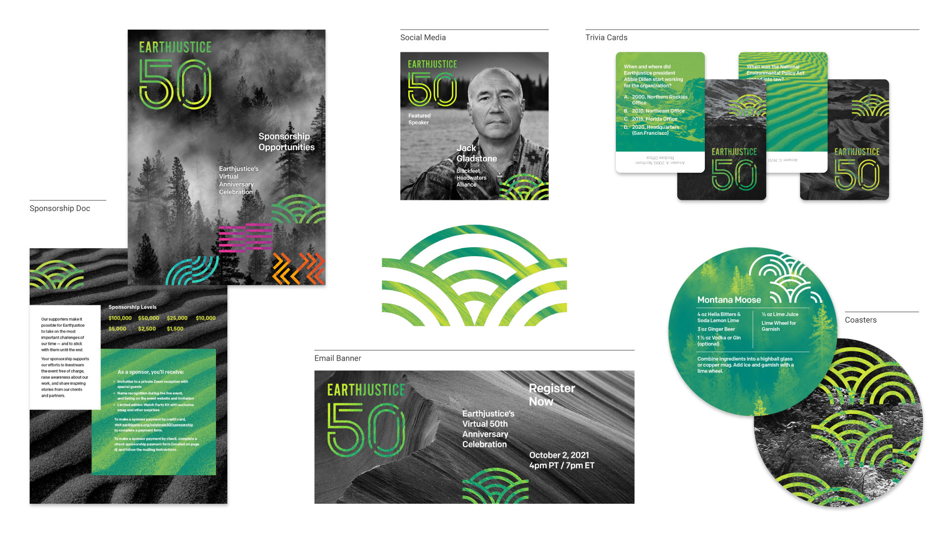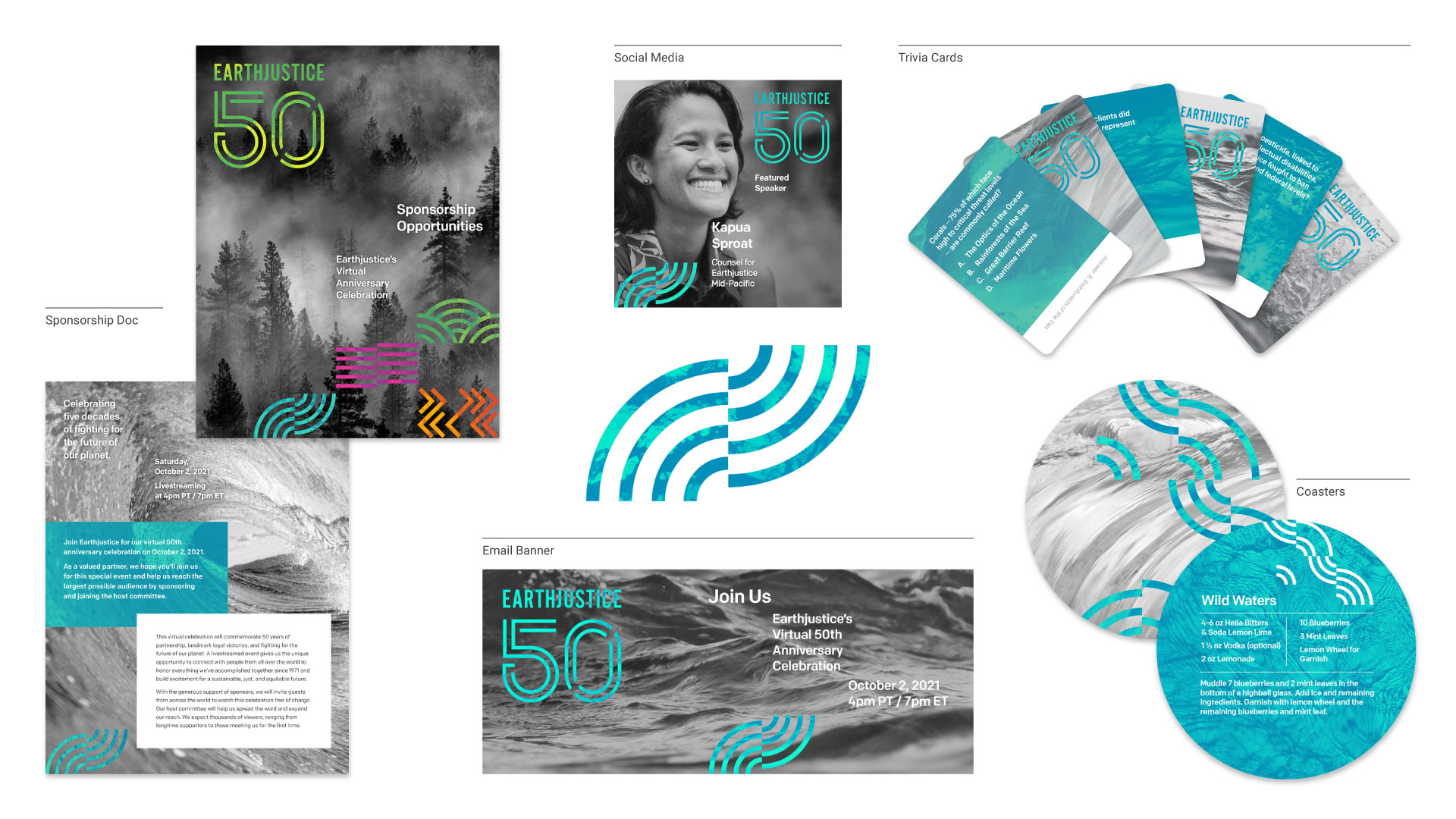 Earthjustice held a hybrid event, commemorating their five decades of fighting for the future of the planet. Hosting the anniversary online allowed guests from around the world to join the celebration. House parties around the country allowed for small gatherings to enjoy the event safely together. To brand this milestone, we returned to the building blocks of nature, using the four elements as an overarching theme.