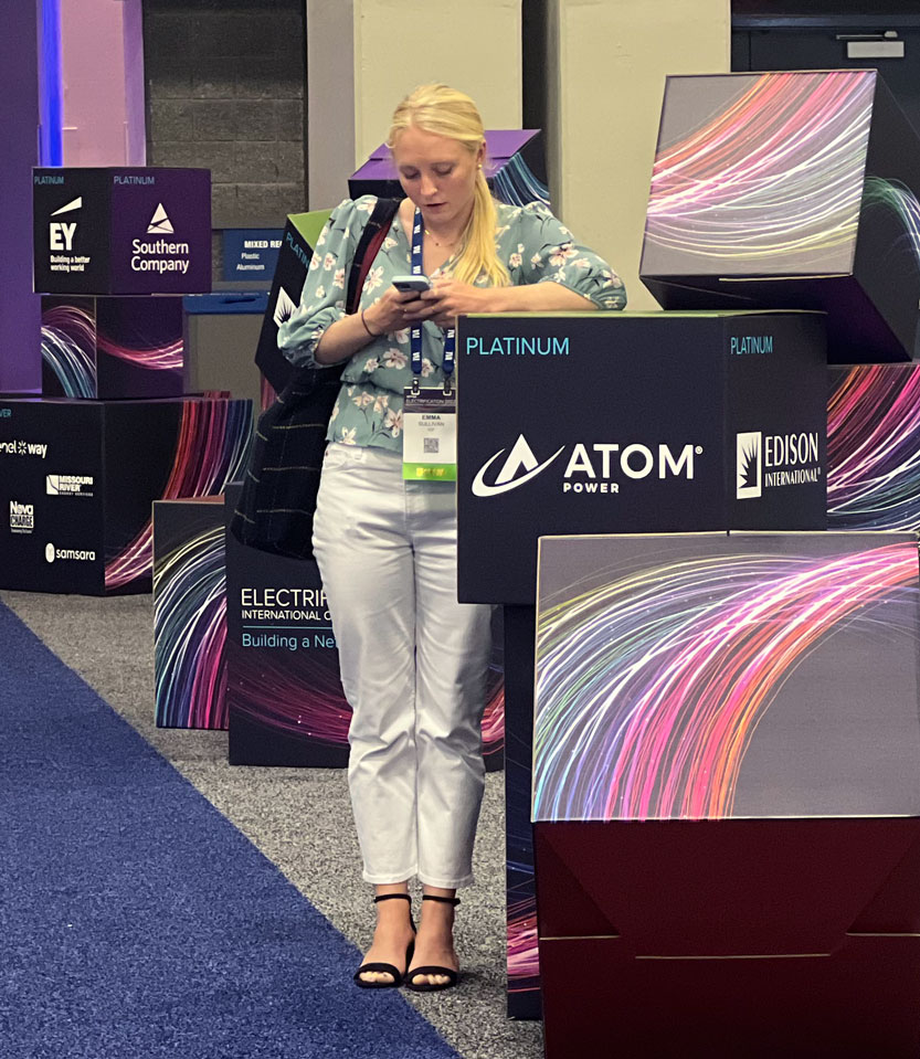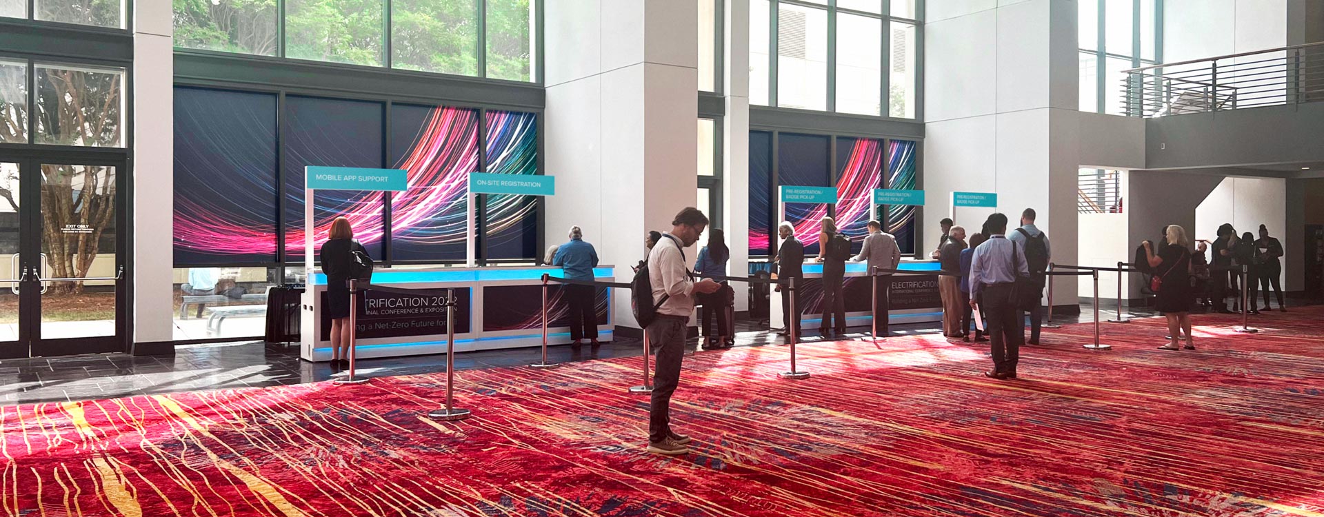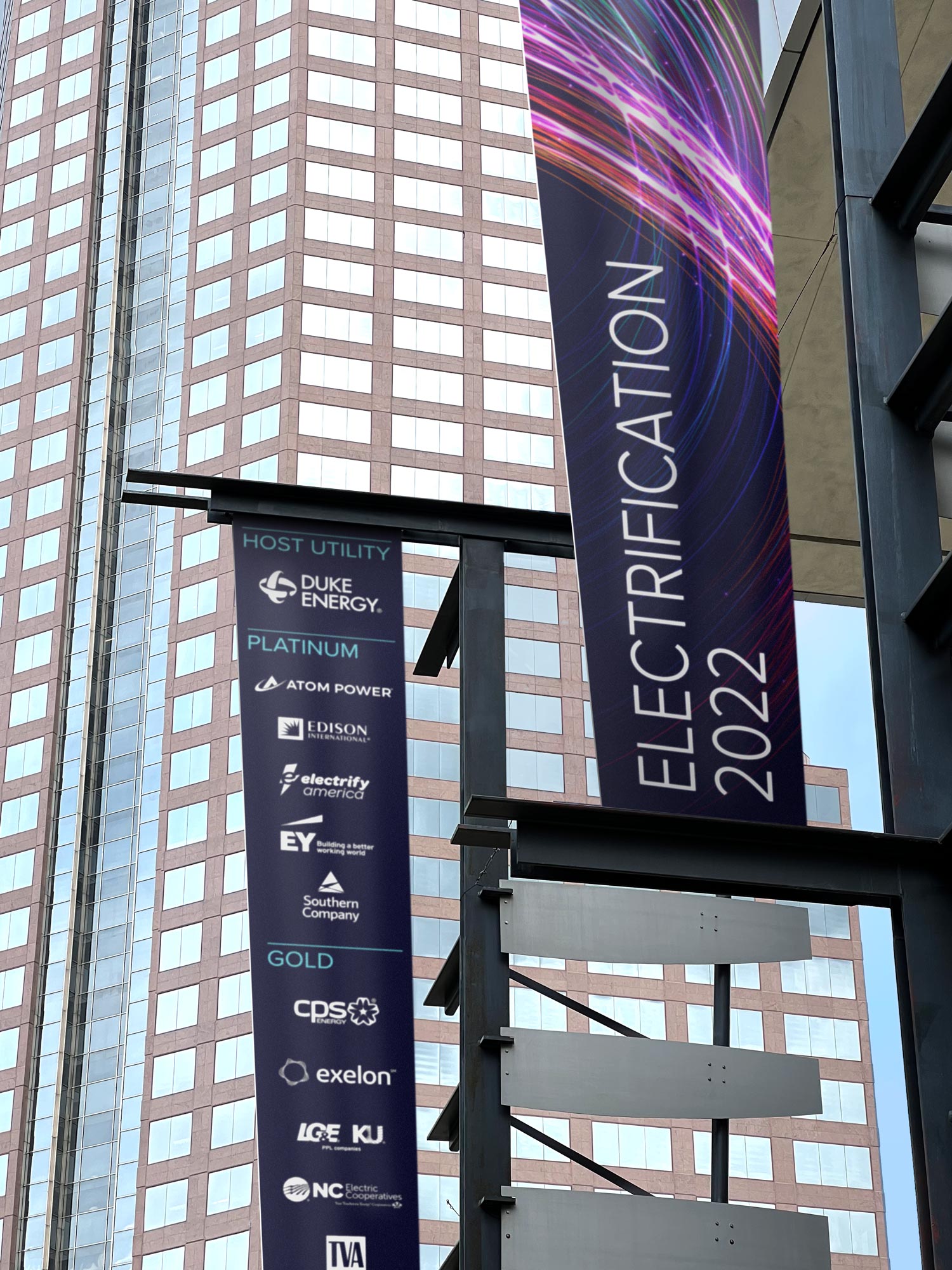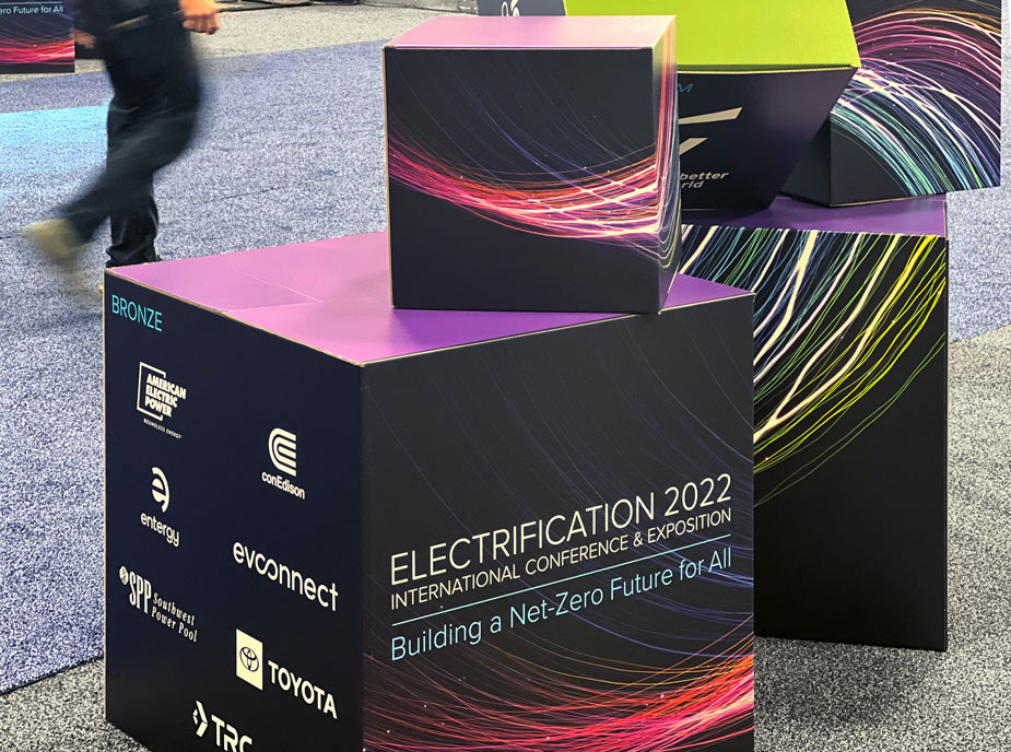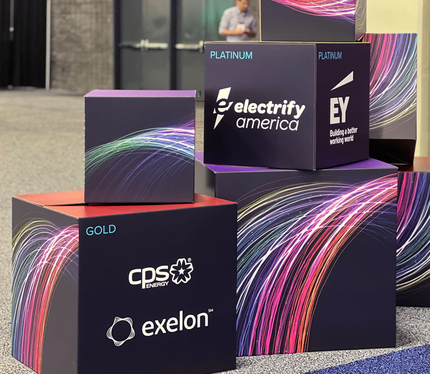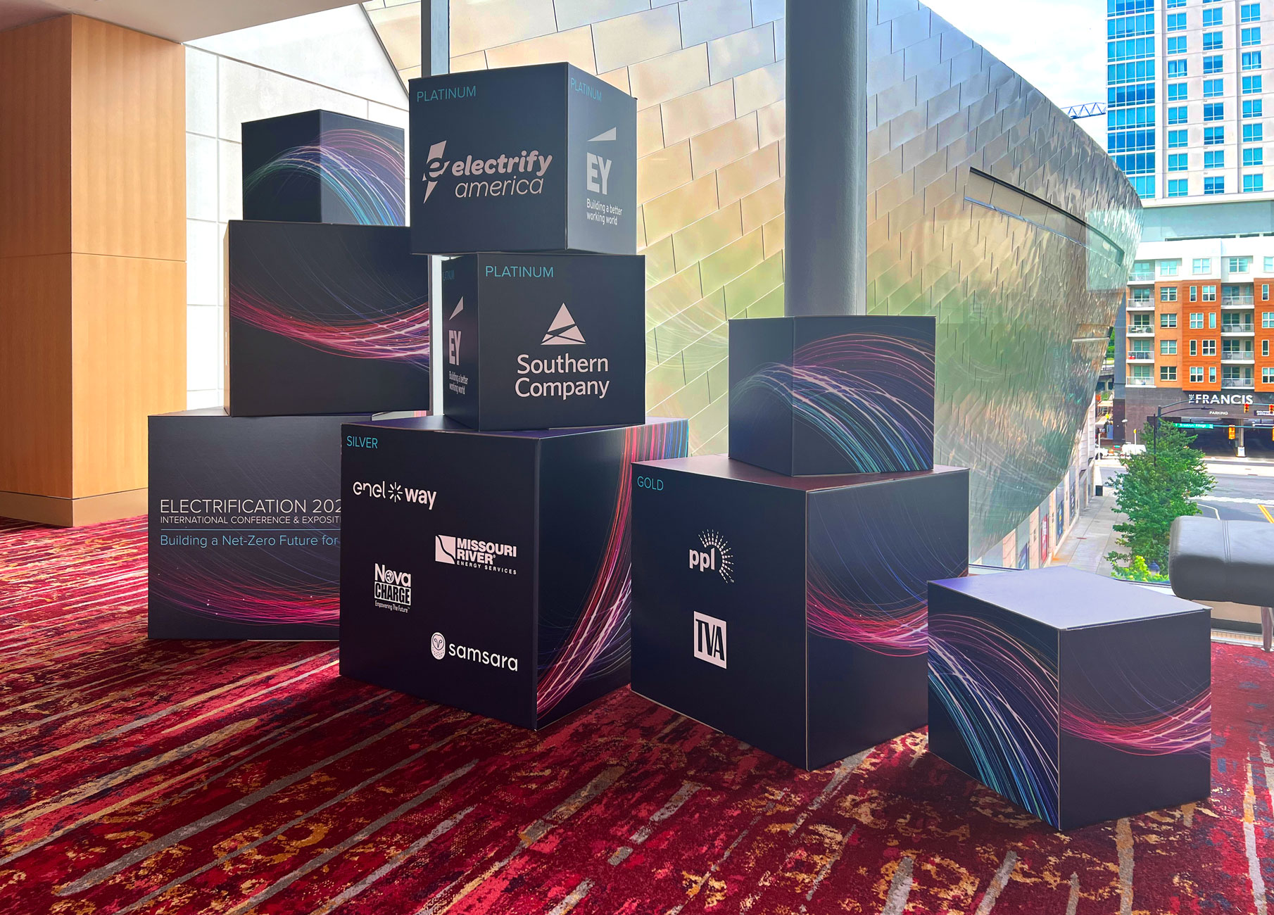 We repurposed mailing boxes custom designed with the Electrification branding to showcase all of the different sponsors. The cubes were grouped in two locations of the convention center — one leading to the plenary sessions and the other at the entry of the main exhibit hall.