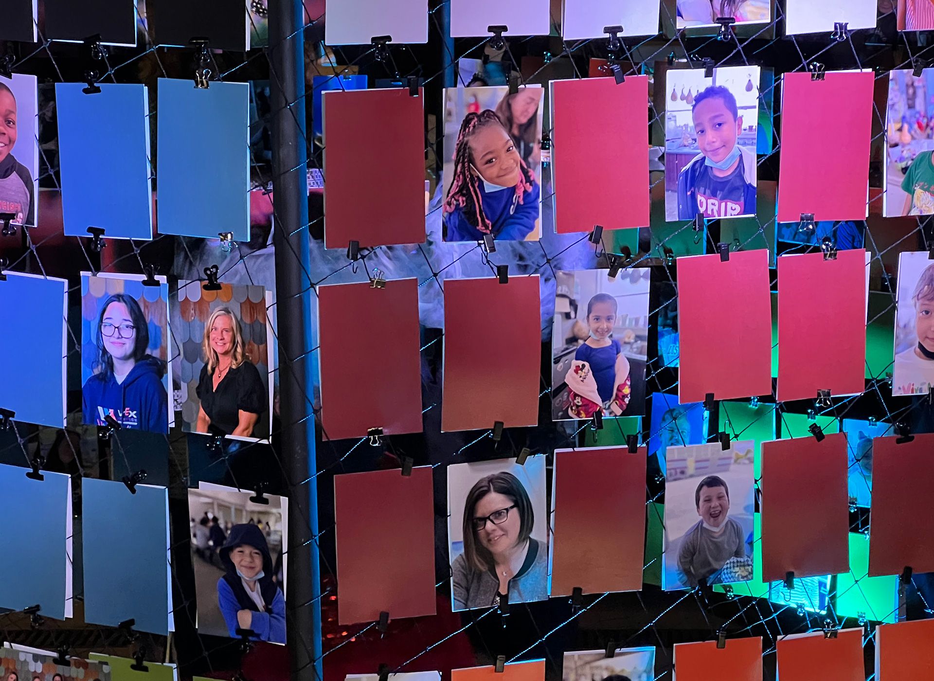 An interactive photo installation designed to celebrate One, the community at the heart of REF, was the creative centerpiece. Photos captured during the event were printed and added to images of students and teachers. As people mingled over drinks after the main presentation, they explored and enjoyed the installation.
