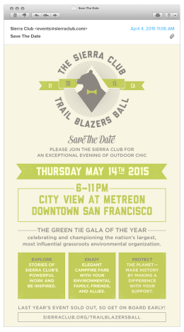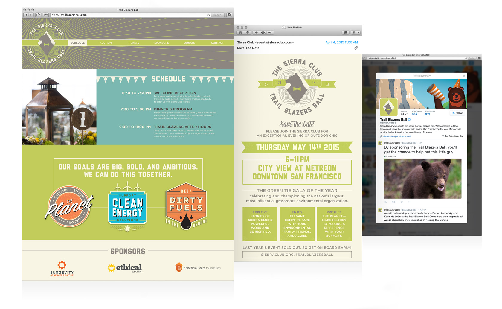 We’ve been planning this glamping trip for months! Following true north on our design map, we used retro-styled illustrations, typography and palette for this Trail Blazers Ball – Sierra Club’s 2nd annual fundraiser. Even Mama Bear donned her pearls for this special event. Designing all these materials for was a fun adventure. The evening was filled with environmental stars, plenty of yummy campfire eats, and generous supporters. (And not one mosquito!)