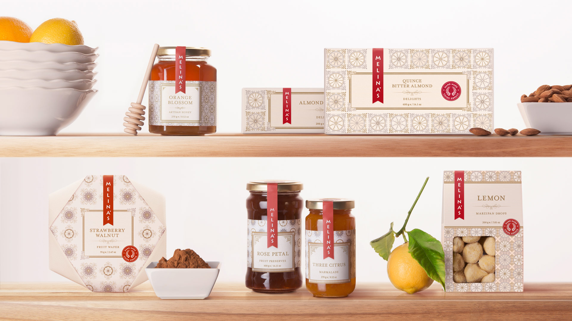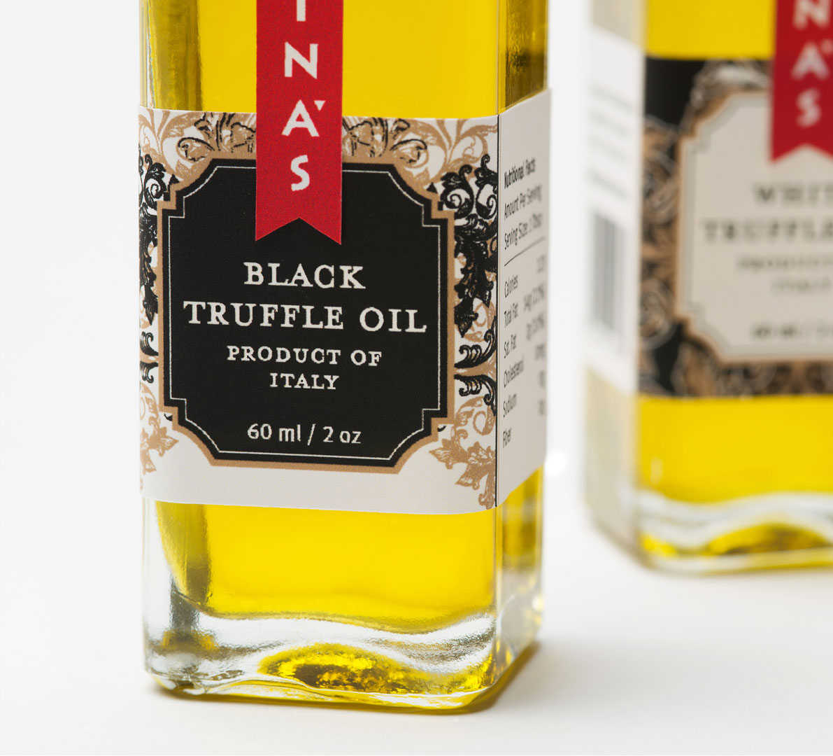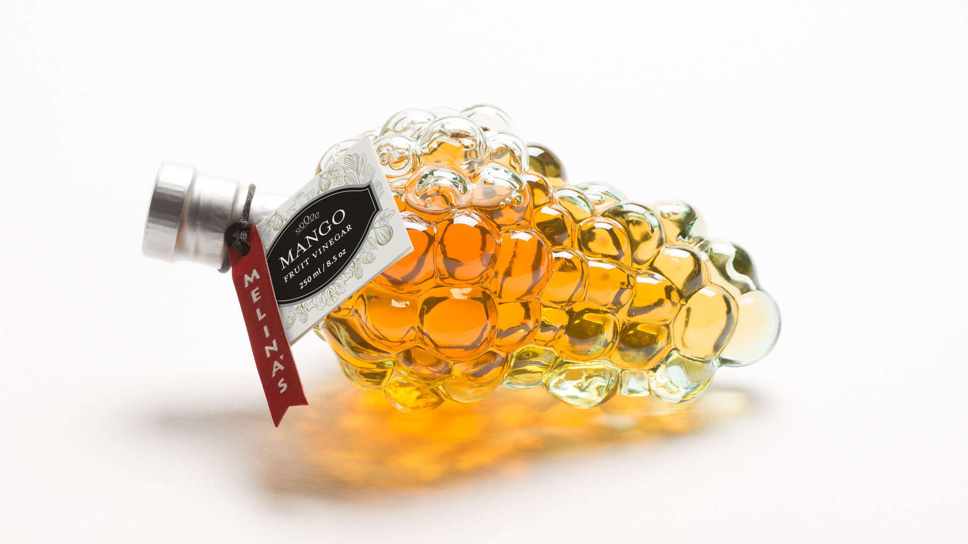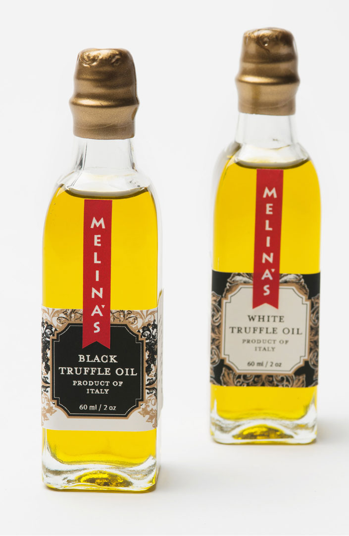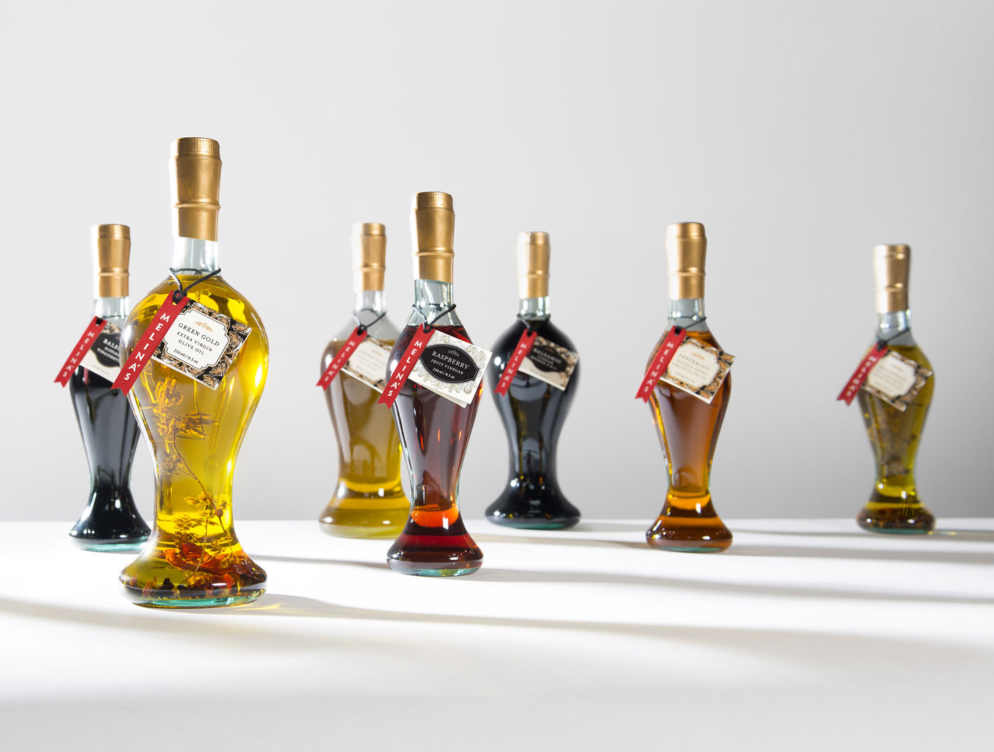 Packaging for Melina’s gourmet line of Mediterranean oils and vinegars started with the logo — rendered here as a standout red fabric hangtag that visually pops off the shelf. We echoed the logo shape on their distinctive glass bottle, shaped organically into the glass and produced in Italy from a custom mold. Each oil and vinegar flavor featured a hangtag label that was actually a mini four-page brochure containing product description, ingredient list, and recipe suggestions. The beauty of this label style was its clean look and ability to be used across different bottle shapes and sizes together with the red logo fabric tag.