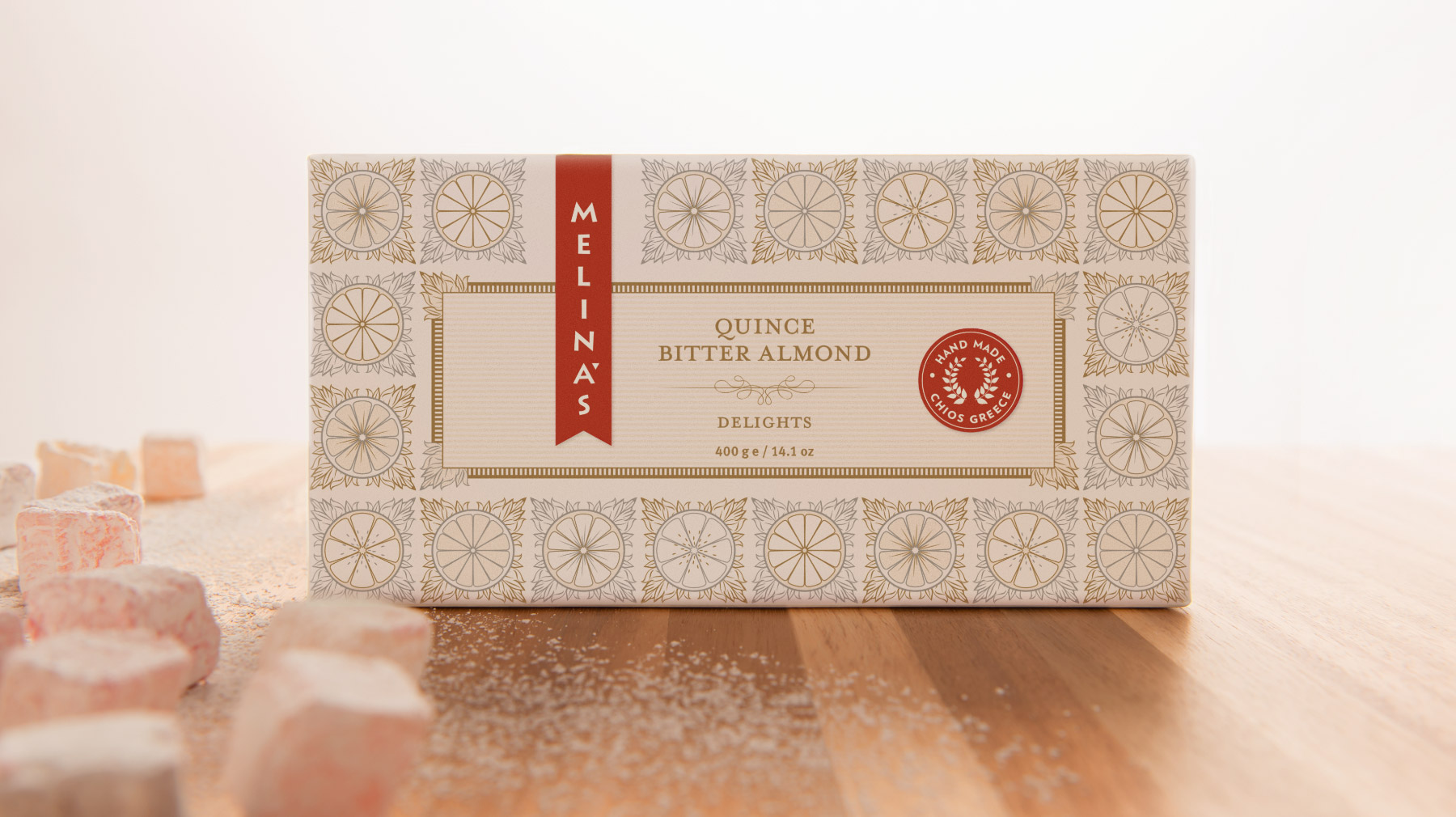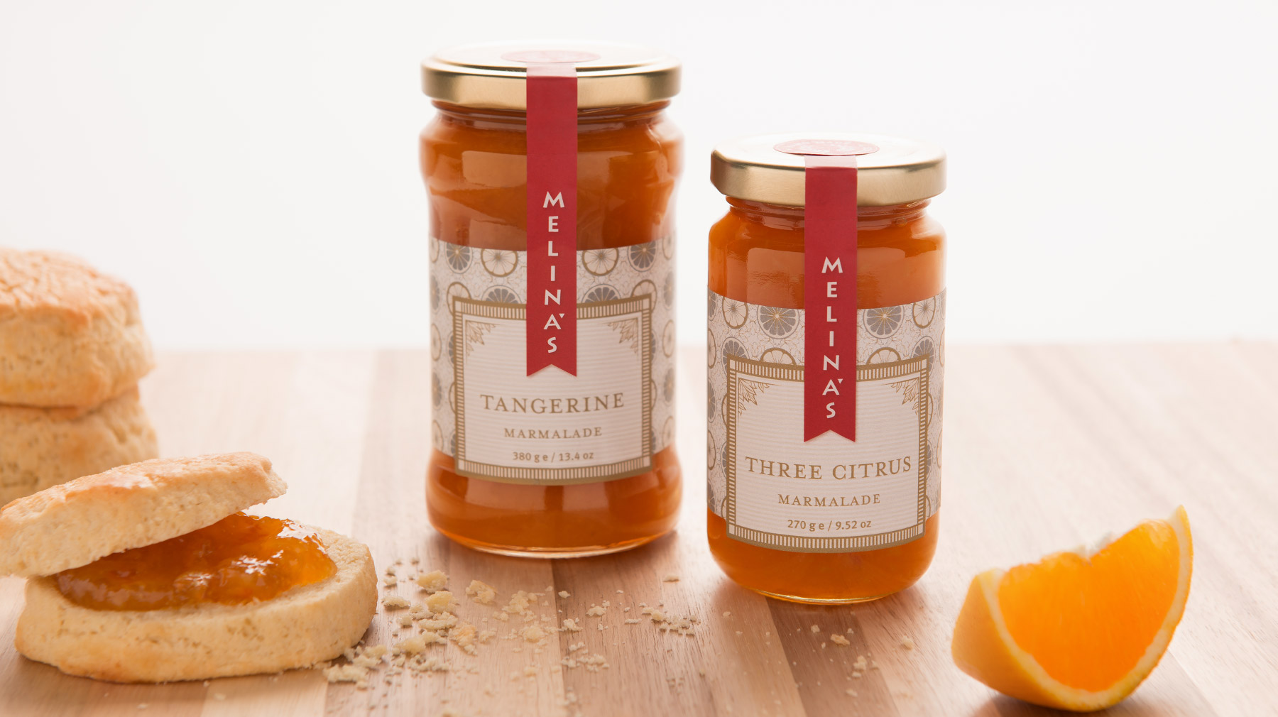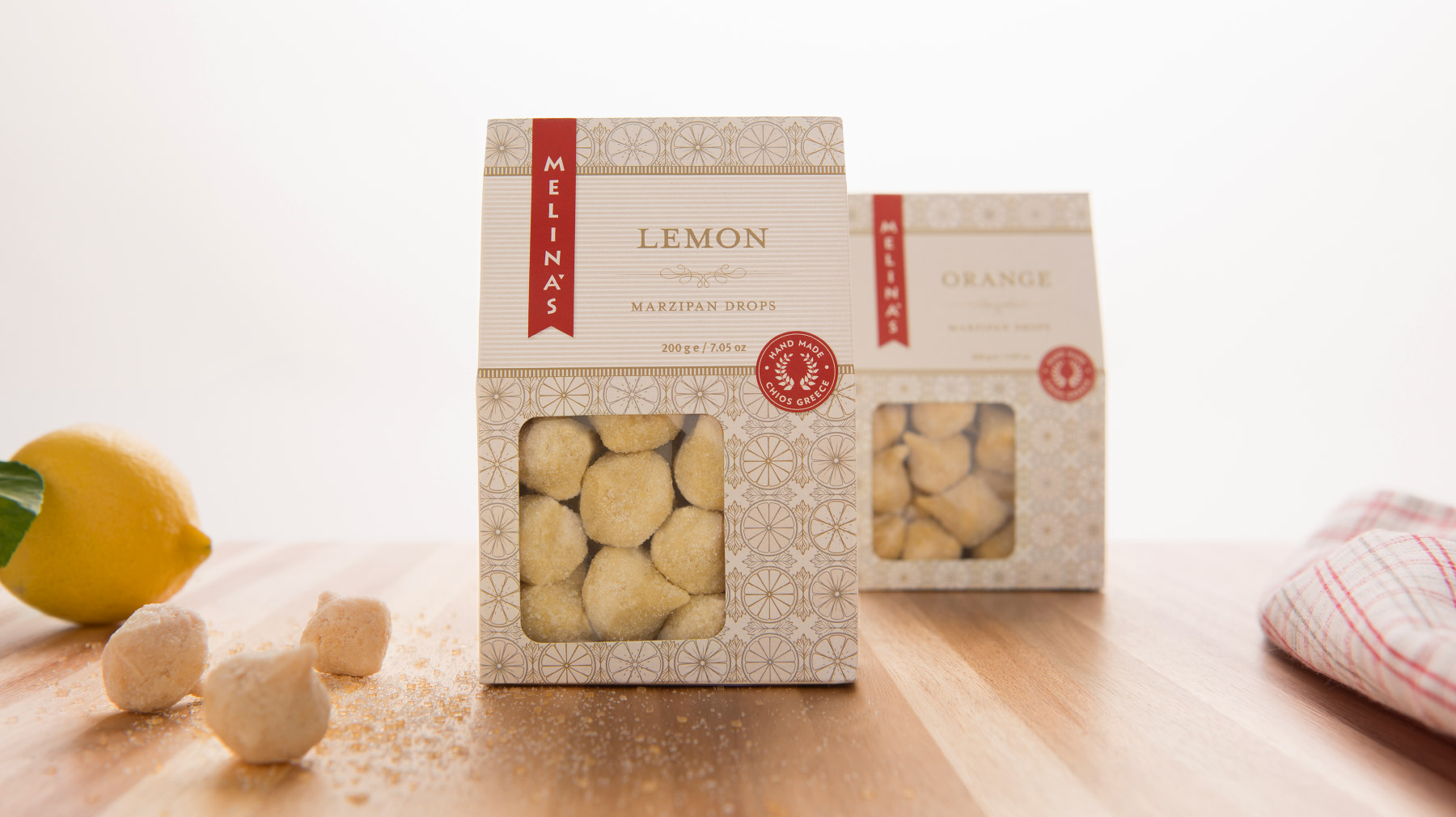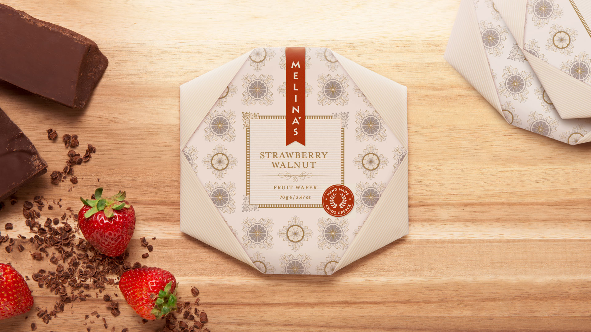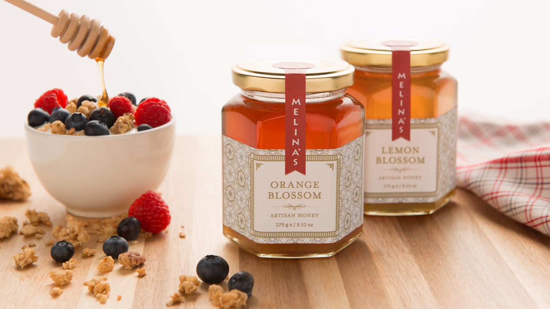 Packaging for Melina’s gourmet line of Mediterranean oils and vinegars started with the logo — rendered here as a standout red fabric hangtag that visually pops off the shelf. We echoed the logo shape on their distinctive glass bottle, shaped organically into the glass and produced in Italy from a custom mold. Each oil and vinegar flavor featured a hangtag label that was actually a mini four-page brochure containing product description, ingredient list, and recipe suggestions. The beauty of this label style was its clean look and ability to be used across different bottle shapes and sizes together with the red logo fabric tag.
